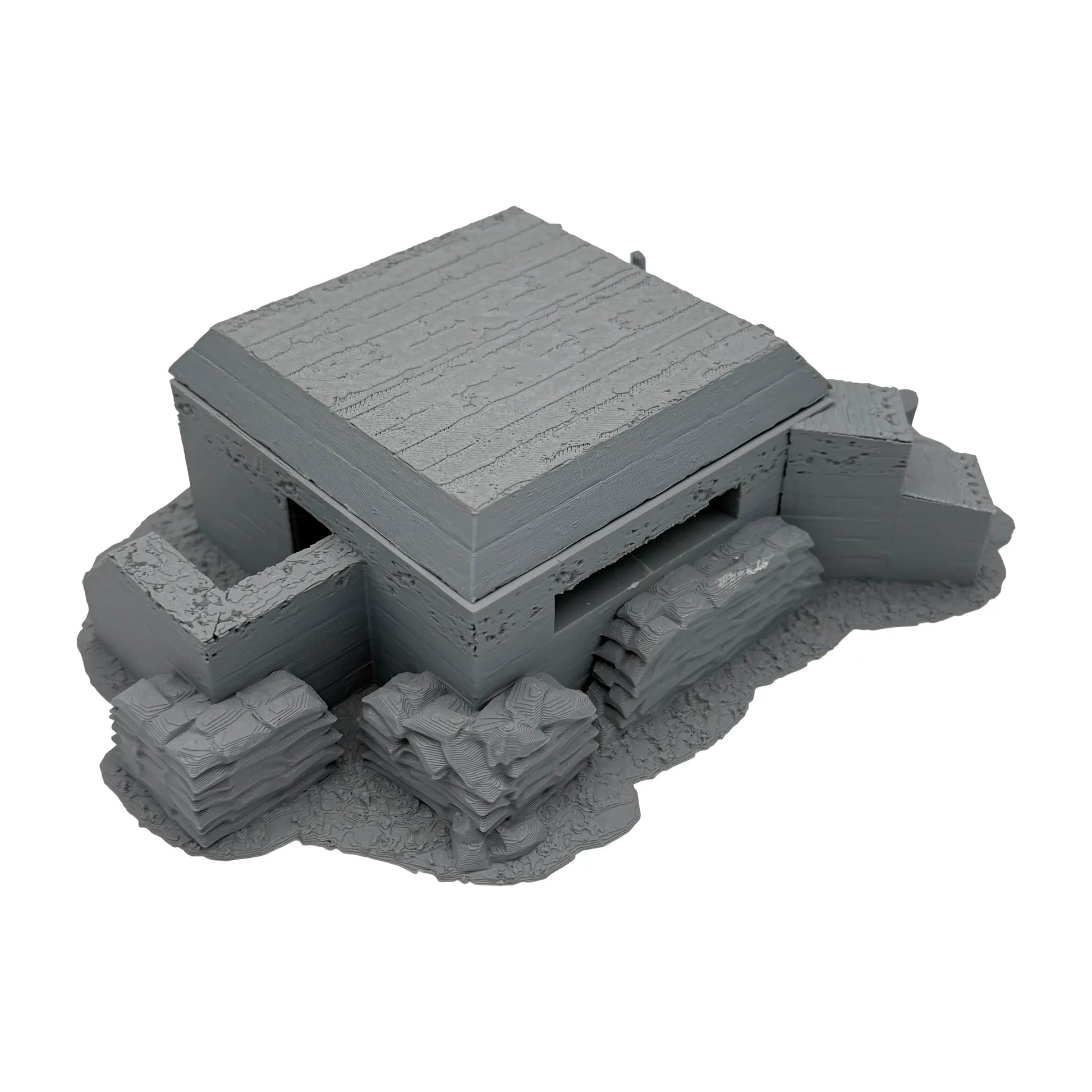 Dieser Betonbunker gehört zu unserer WWII Gelände- und Gebäudeserie und passt zum Beispiel zu Spielsystemen wie Bolt Action, Flames of War und Fields of Glory. Der Bunker hat einen geschützten seitlichen Eingang, vier Schießscharten und das Mauerwerk ist zusätzlich mit Sandsäcken geschützt.. Das Dach des Bunkers ist abnehmbar und im Innenraum bespielbar.