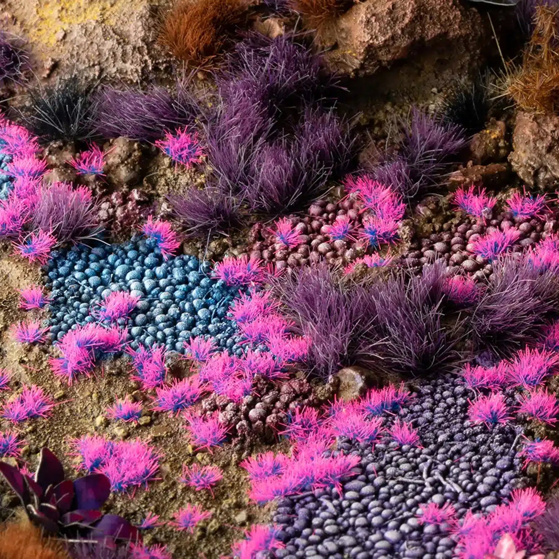 Sehr kleine Grasbüschel in Blau- und Rosatönen, die miteinander vermischt sind und einen sehr starken und verwirrenden Eindruck hinterlassen. Perfekt, um eher seltsame außerirdische Pflanzen zu kreieren, die in Ihren Science-Fiction-, Fantasy- oder magischen Basen und Modellen fast zu leuchten scheinen. In Kombination mit anderen Farben und Größen sorgen sie für eine verwirrende Farbvariation deiner Welten.