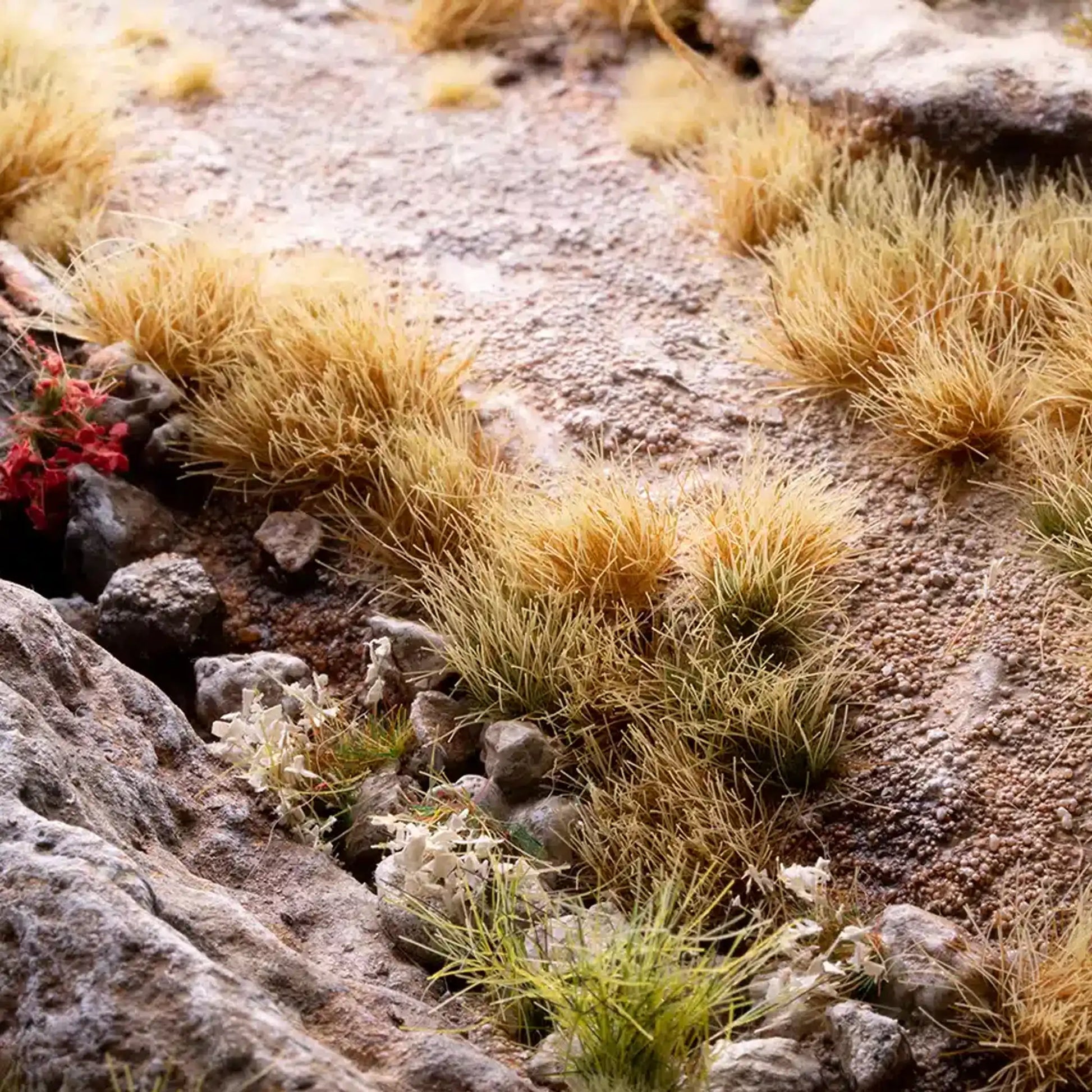 Braun-gelbliche Grasbüschel. Am besten geeignet für die Nachbildung trockener und karger Lebensräume mit spärlicher Vegetation, wie halbwüstenartige Ebenen oder Bergklippen. In Kombination mit anderen Grüntönen verleihst du deinen nachgebildeten dichten Prärien, Steppen und Waldböden mehr Realismus.
