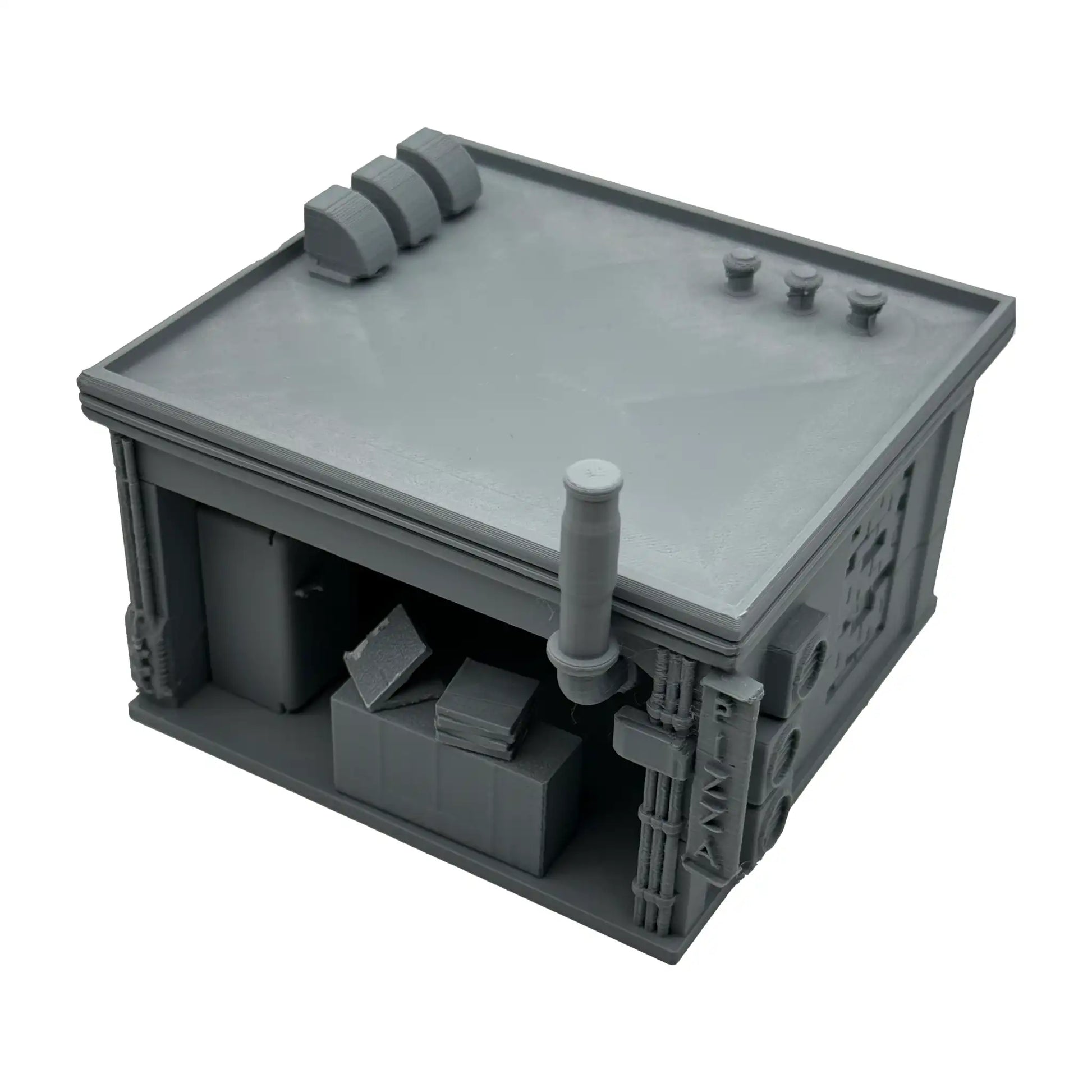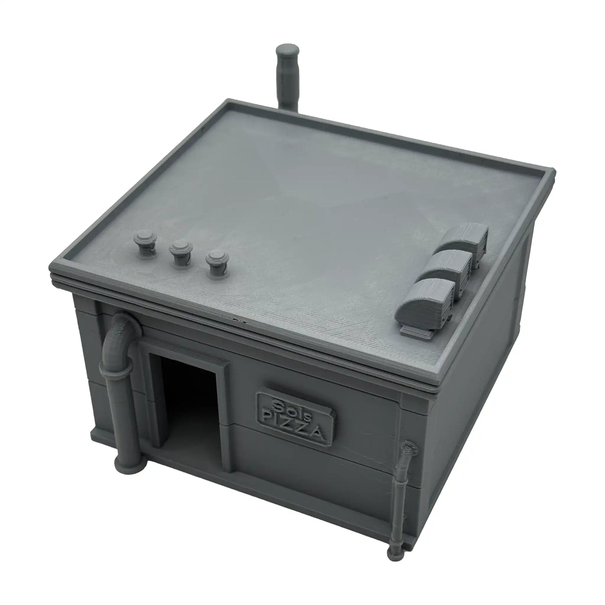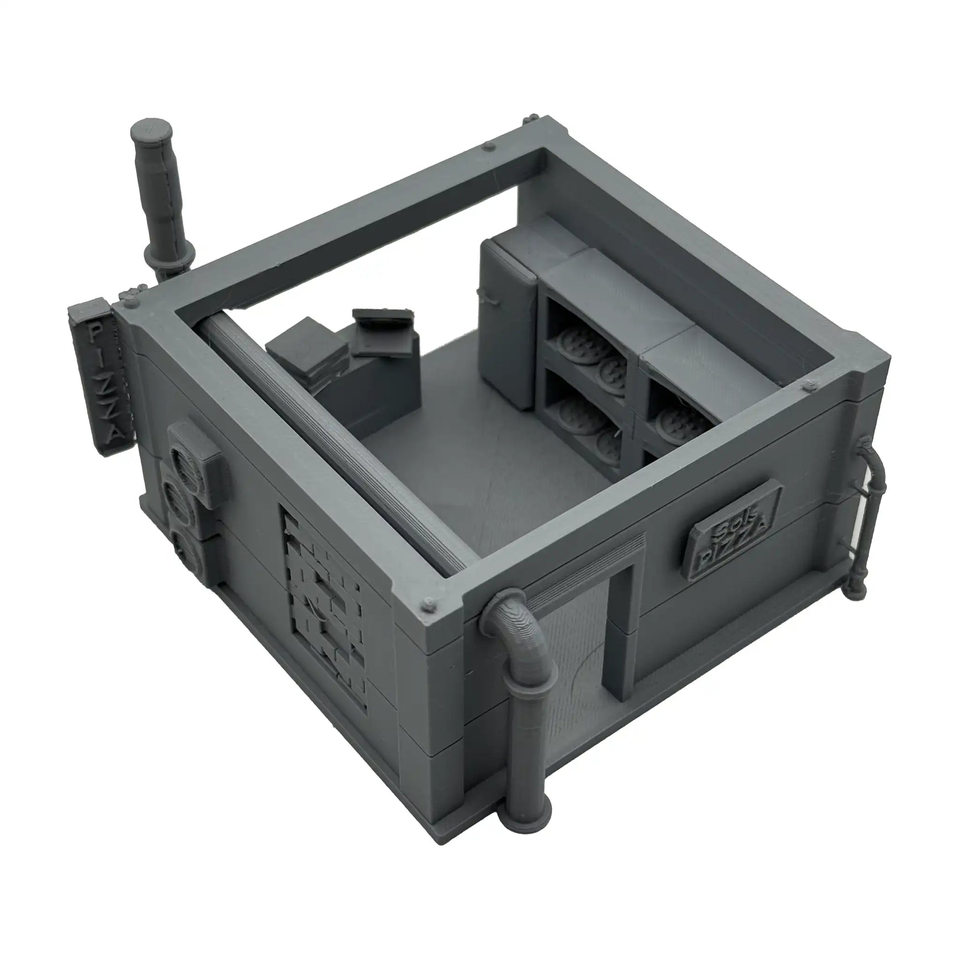 Das perfekte Cyperpunk-Setting für deinen Spieltisch. Die Pizzeria hat ein abnehmbares Dach wodurch der Innenraum bespielbar ist. Zur Einrichtung gehört ein Pizzaofen, ein Kühlschrank, ein Verkaufstresen, sowie eine offene Pizzaschachtel und ein Stapel mit Pizzen.